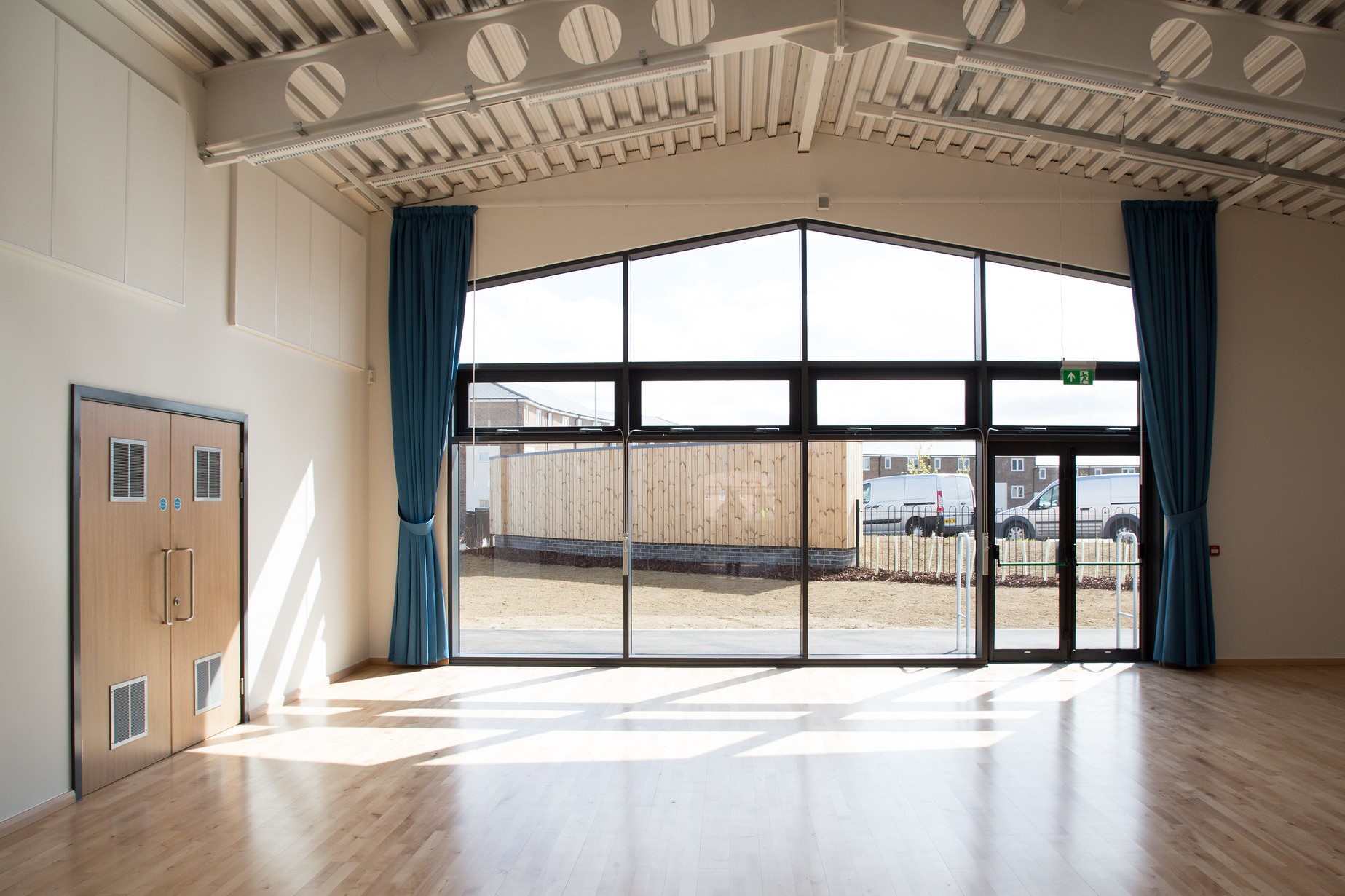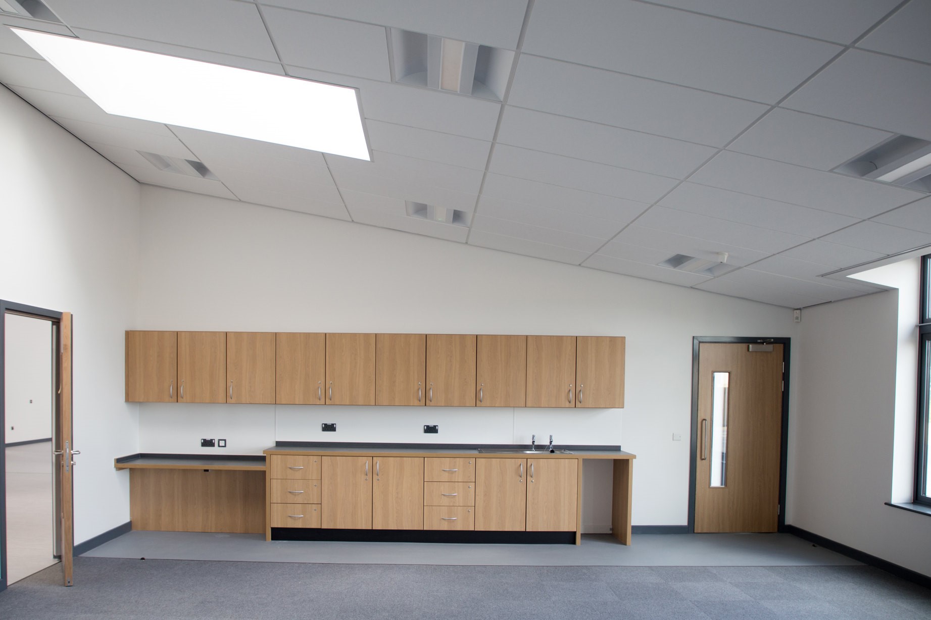 A Sunesis new build school in Yeovil, part of a framework of identical schools being built all over the country. Topfix Interiors installed external wall coverings, internal partitions, independent wall linings, suspended ceilings including MF and mineral fibre tiles into grid, acoustic wall panels installed to the hall, timber detail installed to corridors to conceal services, plastered finish.
