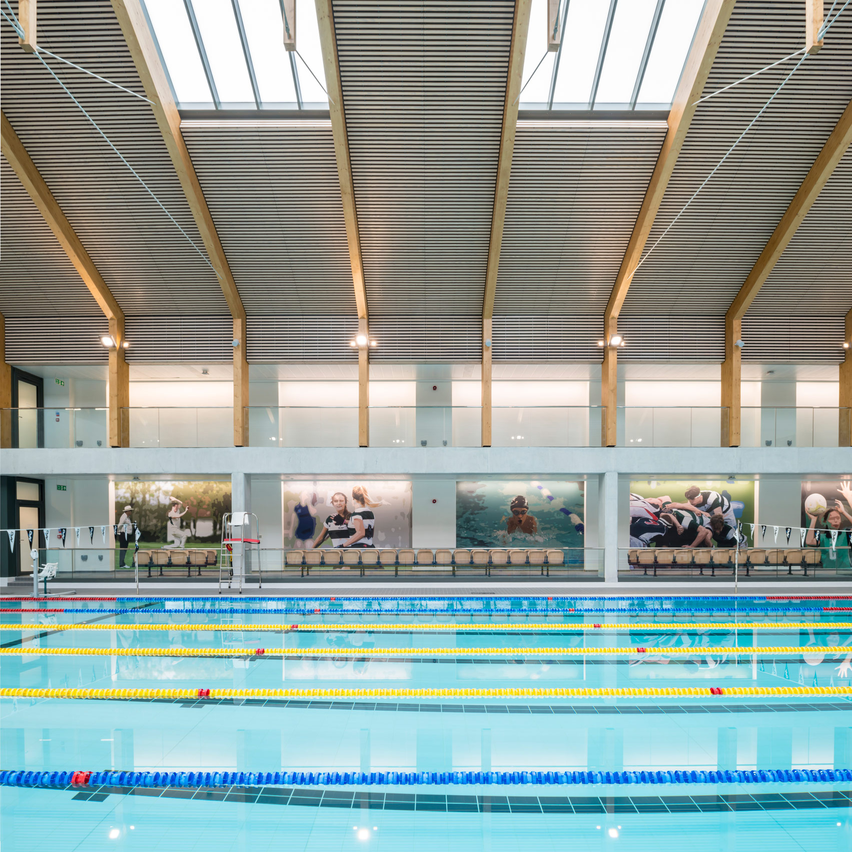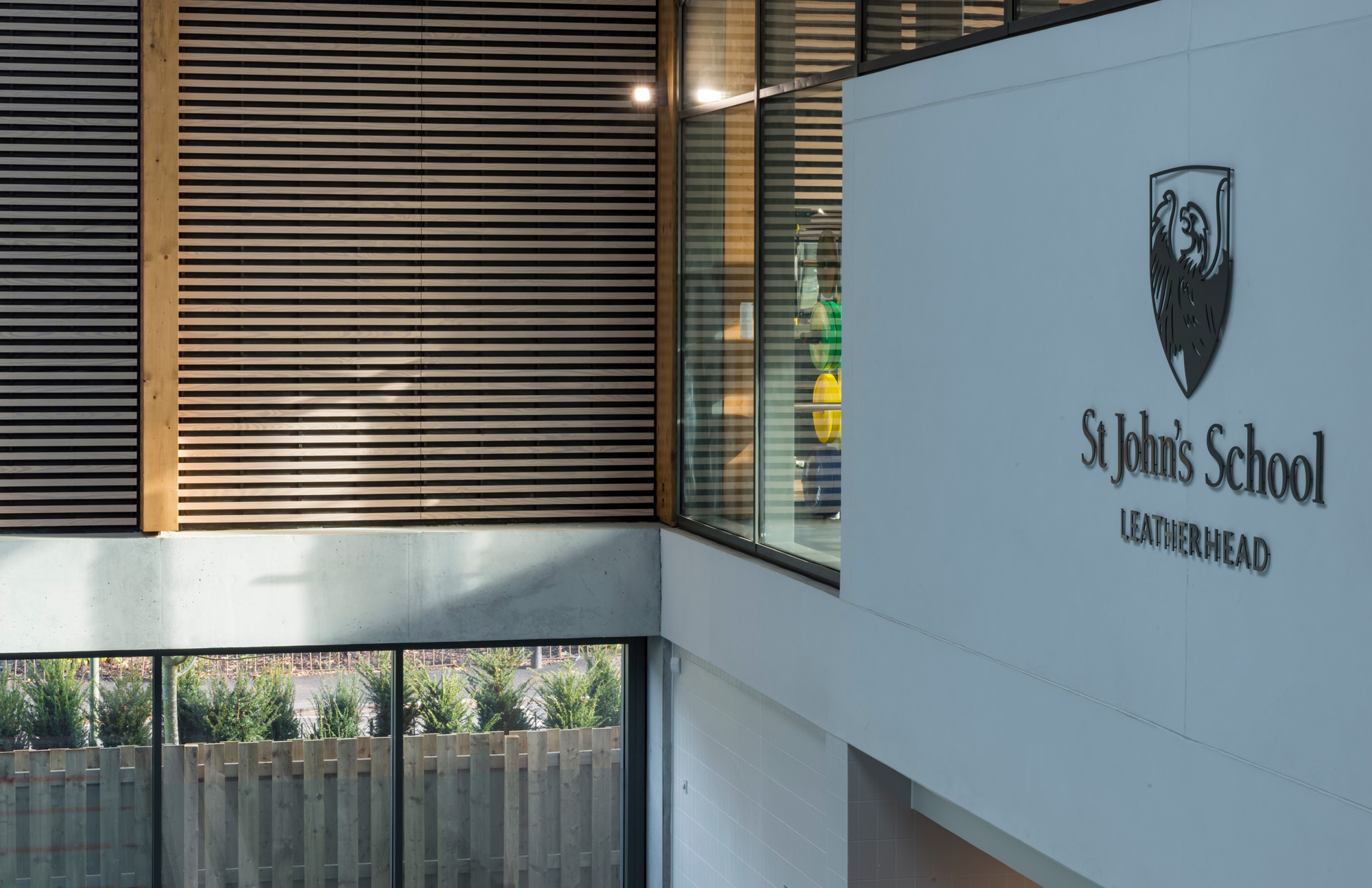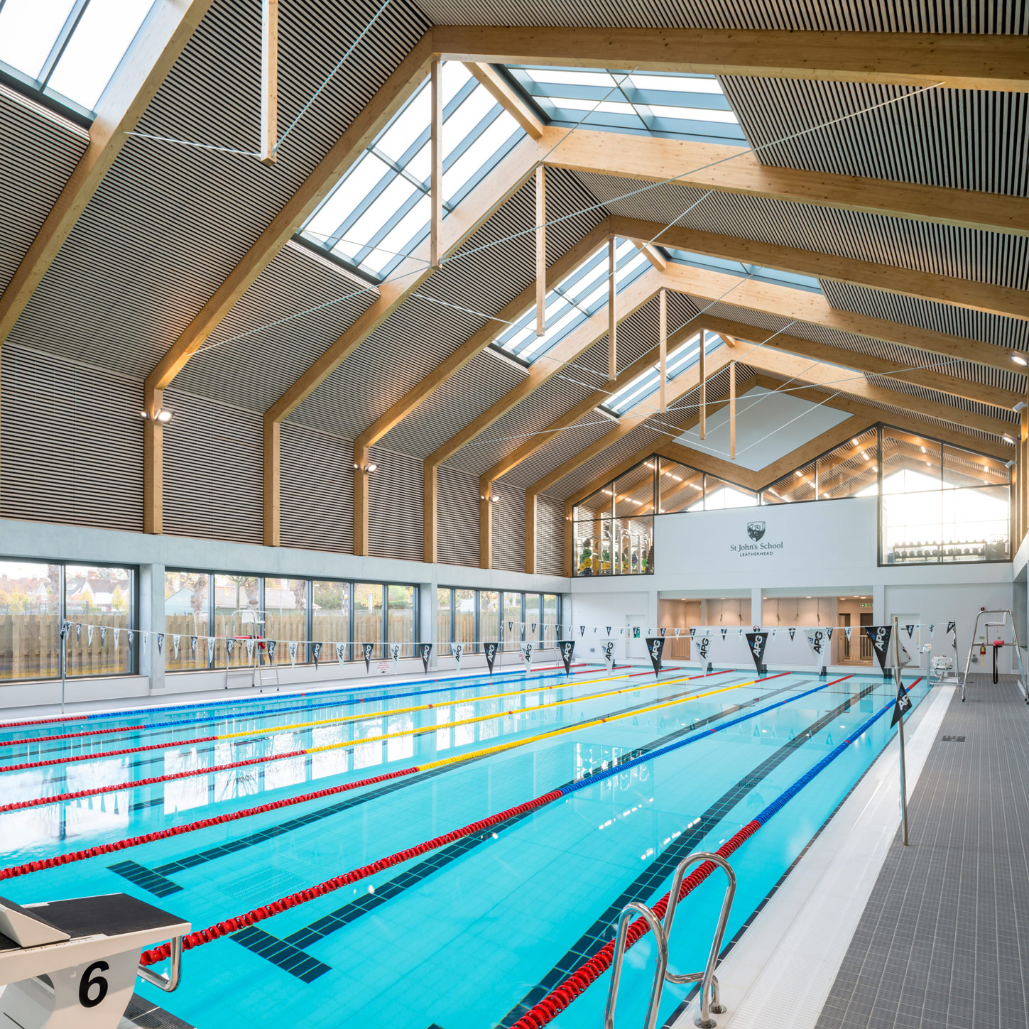 A new sports complex at St John's School in Leatherhead houses a 6 lane, 25m competition swimming pool and fitness gym as well as various multi-use spaces including a dance studio and classrooms.