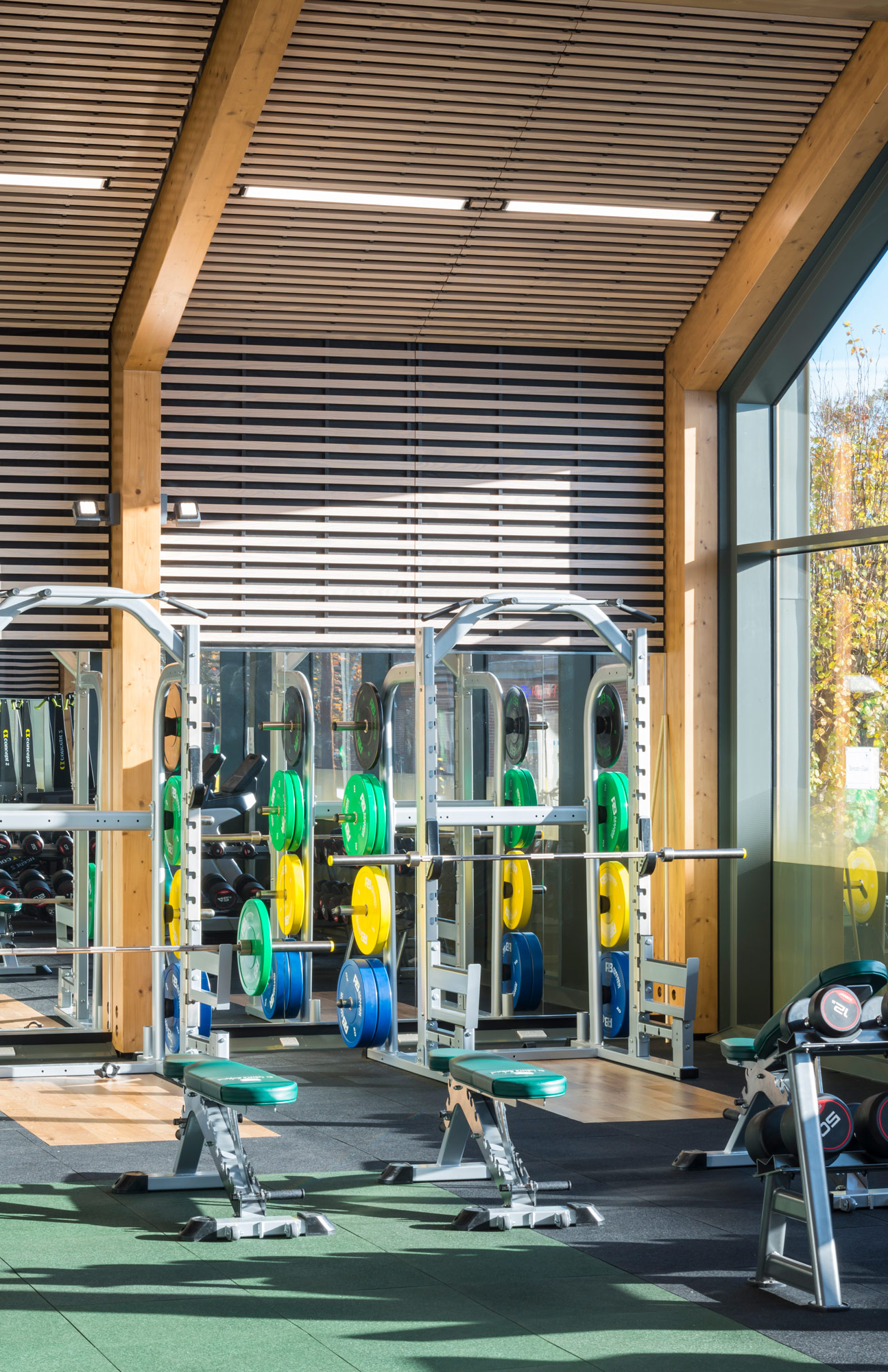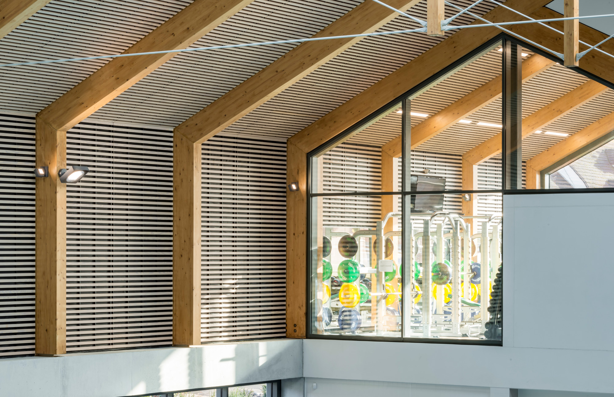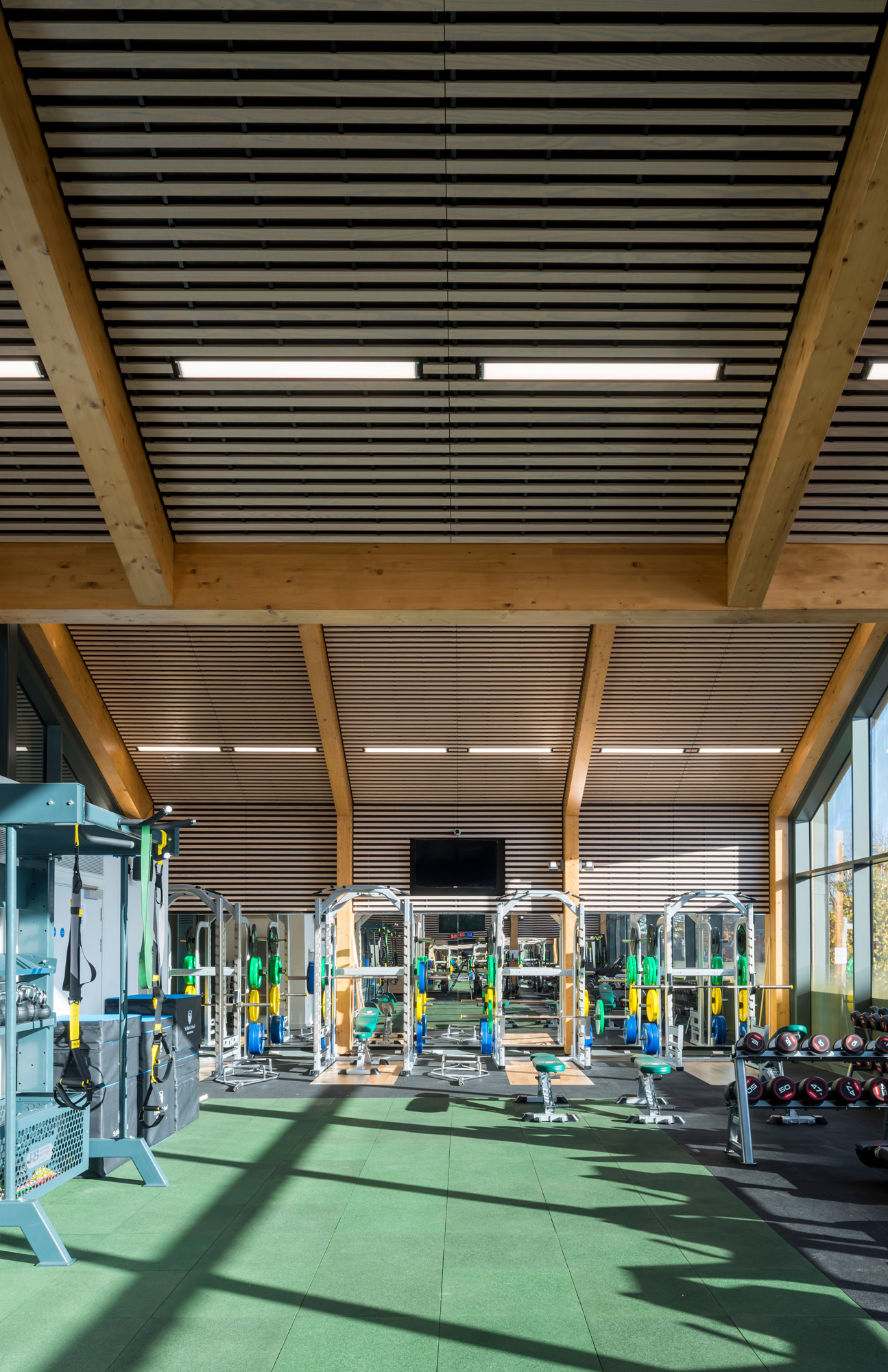 Topfix Interiors installed almost 1000m2 of Oranit Shiluvit panels to clad the pitched ceiling which spans across the pool and gym areas. The linear blade format of the Oranit panels make it ideal for fitting around the dramatic glulam beams and skylights as well as for the integrating strip lighting to the gym space.