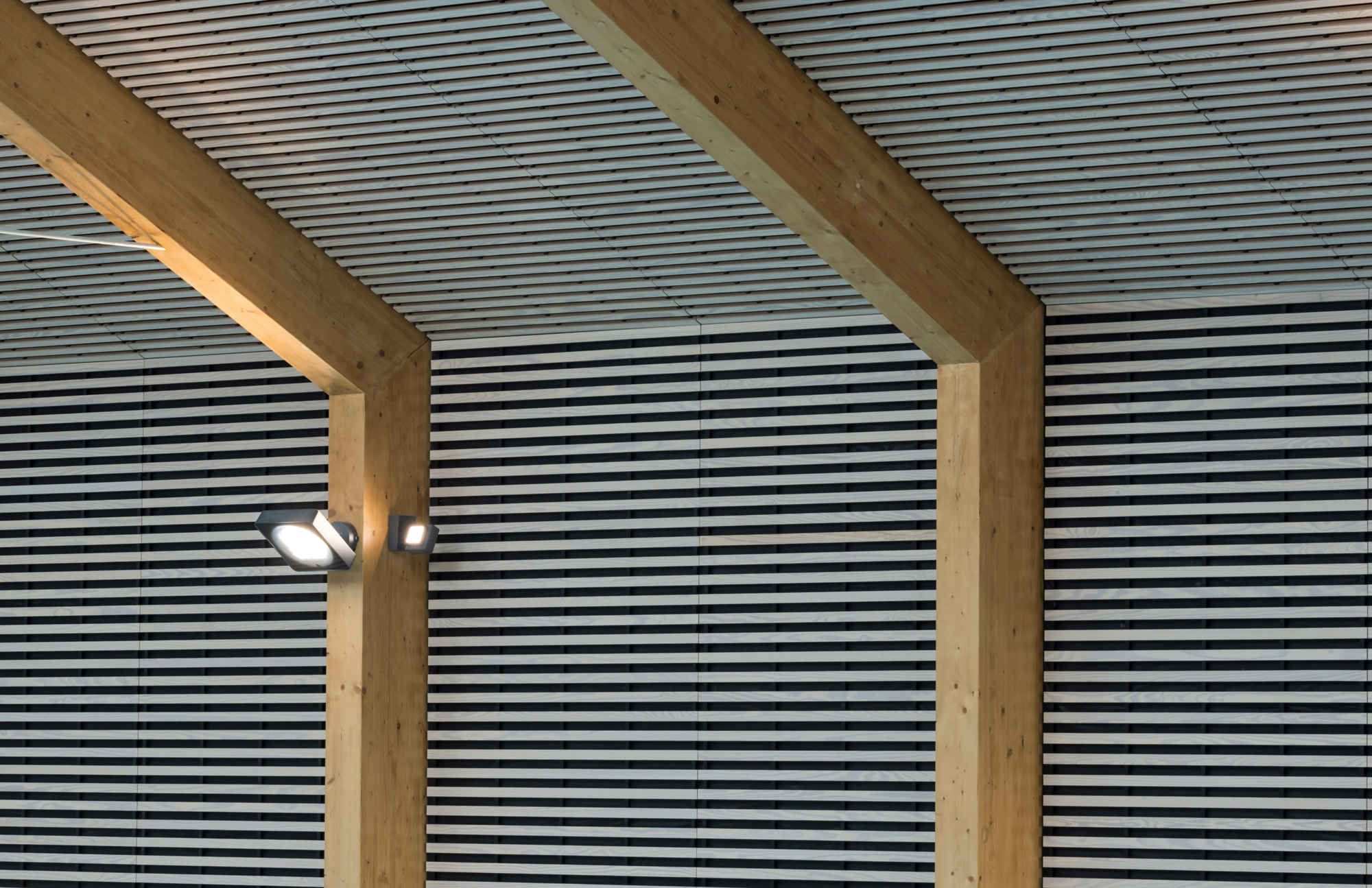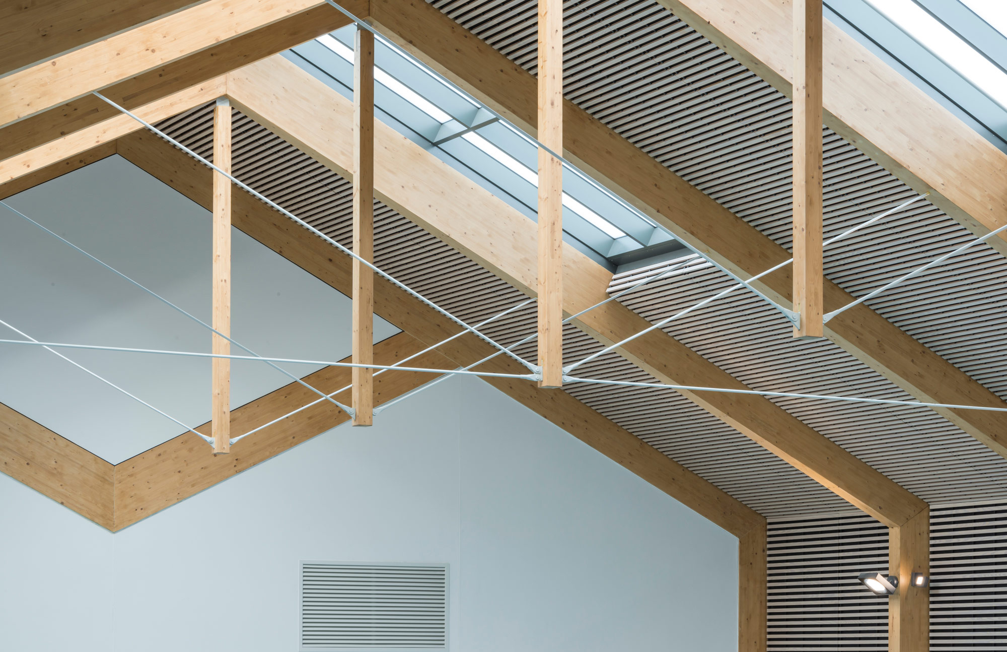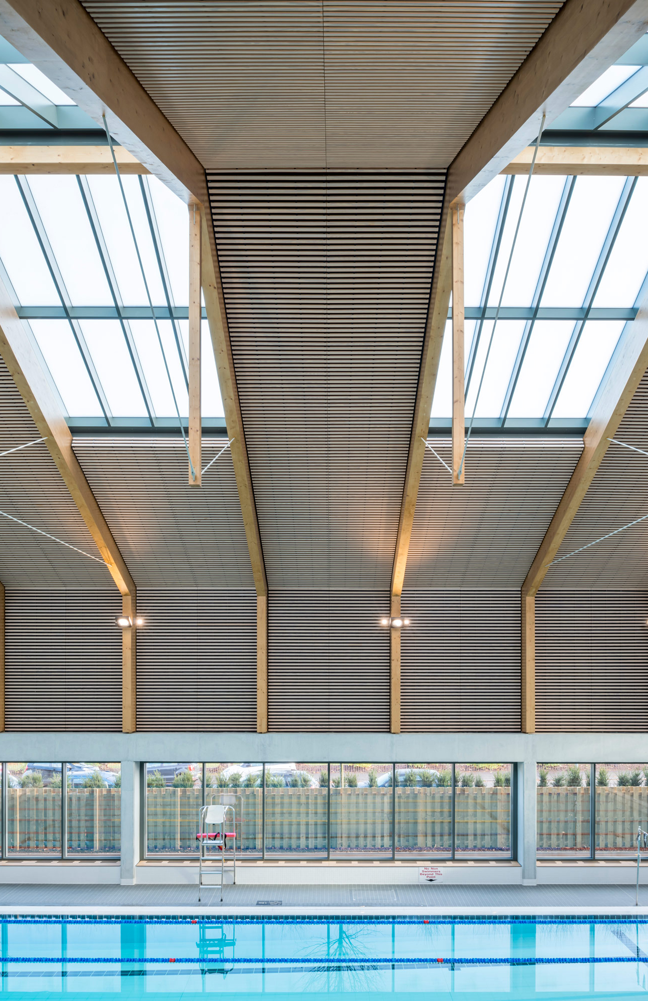 Topfix Interiors installed almost 1000m2 of Oranit Shiluvit panels to clad the pitched ceiling which spans across the pool and gym areas. The linear blade format of the Oranit panels make it ideal for fitting around the dramatic glulam beams and skylights as well as for the integrating strip lighting to the gym space.